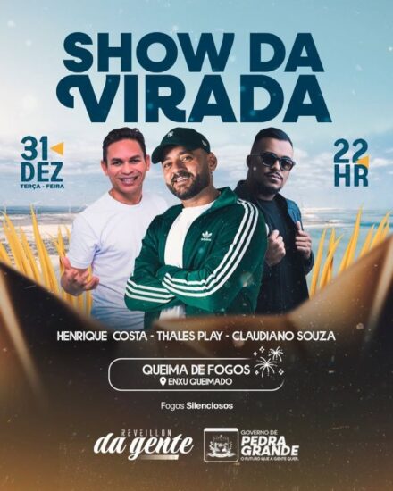 “Vamos receber um novo ano com alegria e viver juntos a esperança de viver um 2025 cheio de grande conquistar e desenvolvimento para Pedra Grande. Venha celebrar a chegada de 2025 com a família e os amigos, no Show da Virada no Terminal Turístico da praia de Enxu Queimado”.