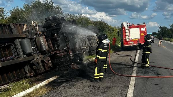 No local, os bombeiros identificaram fogo nos pneus de três eixos de uma carreta bi trem, previamente desconectada do cavalo mecânico após tombar na rodovia. A carga — composta por lâminas de alumínio — não foi atingida pelas chamas.