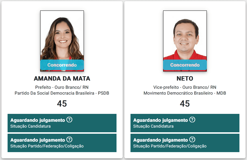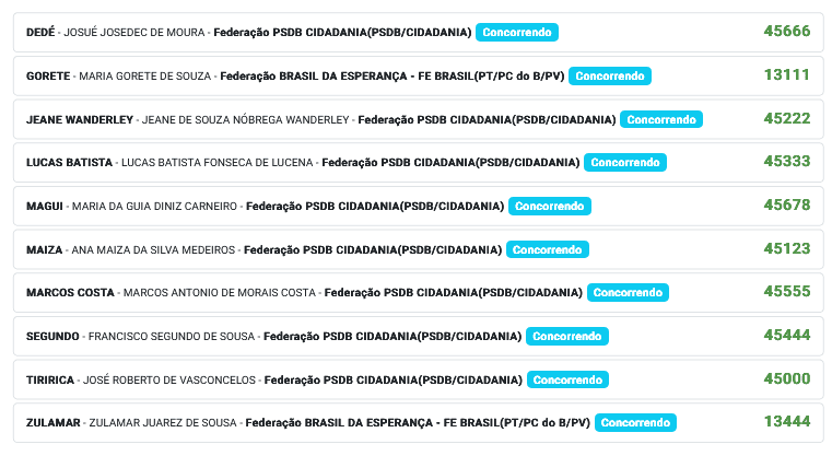 O sistema também já exibe os pedidos de registros de candidatura a vereadoras e vereadores pela Federação PSDB Cidadania dos candidatos: Segundo (nº 45 444), Tiririca (nº 45 000), Marcos Costa (nº 45 555), Lucas Batista (nº 45 333), Dedé (nº 45 666), Maiza (nº 45 123), Magui (nº 45 678), e Jeane Wanderley (nº 45 222), escolhidos em convenção histórica realizada no último dia 5 de agosto.