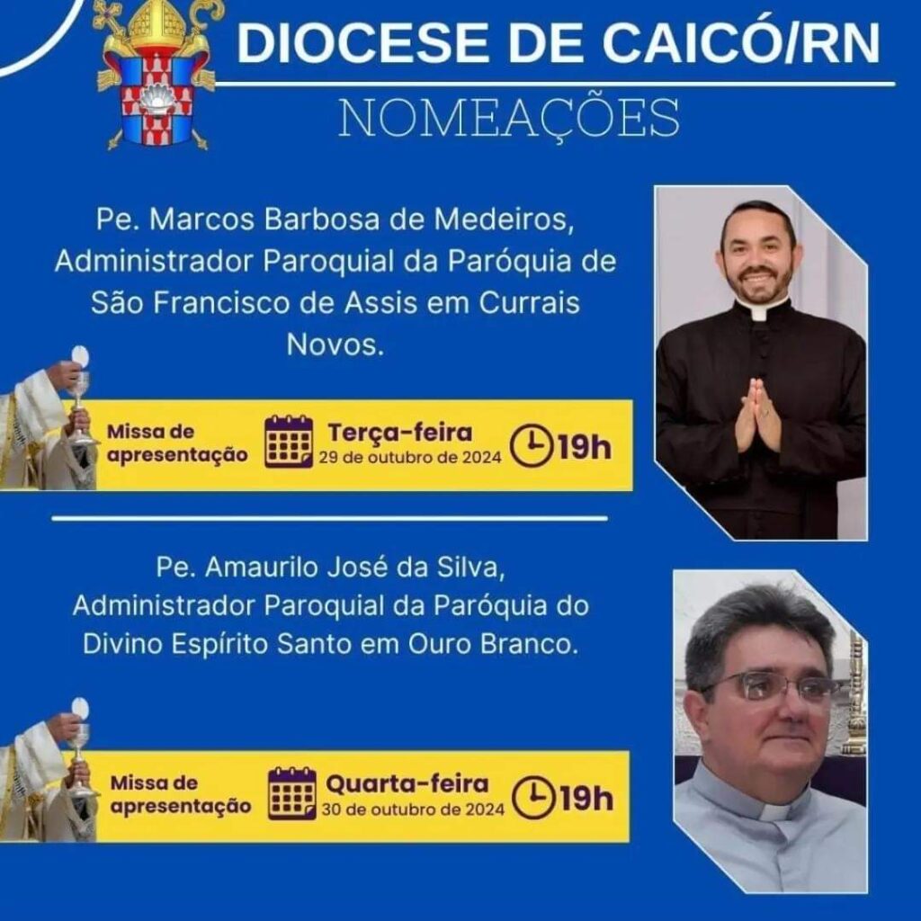 A diocese de Caicó anunciou nas redes sociais a mudança de Pároco Administrador da Paróquia do Divino Espírito Santo