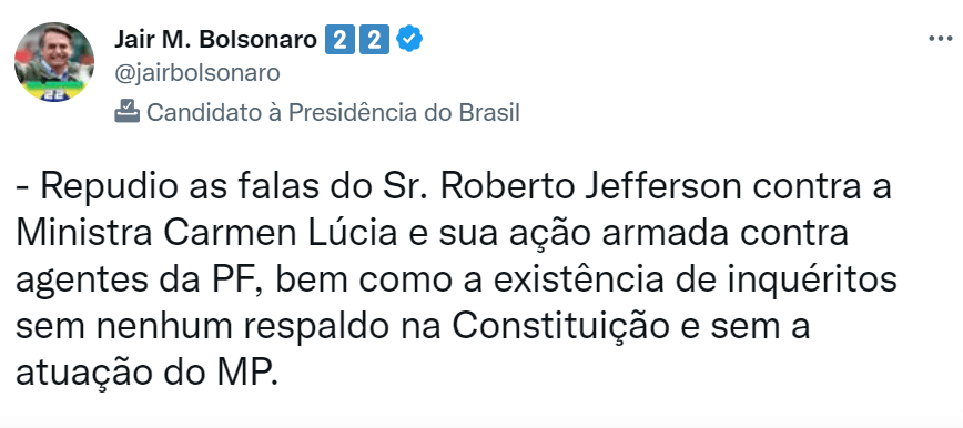 “Repudio as falas do Sr. Roberto Jefferson contra a Ministra Carmen Lúcia e sua ação armada contra agentes da PF, bem como a existência de inquéritos sem nenhum respaldo na Constituição e sem a atuação do MP”, escreveu Bolsonaro no Twitter.
