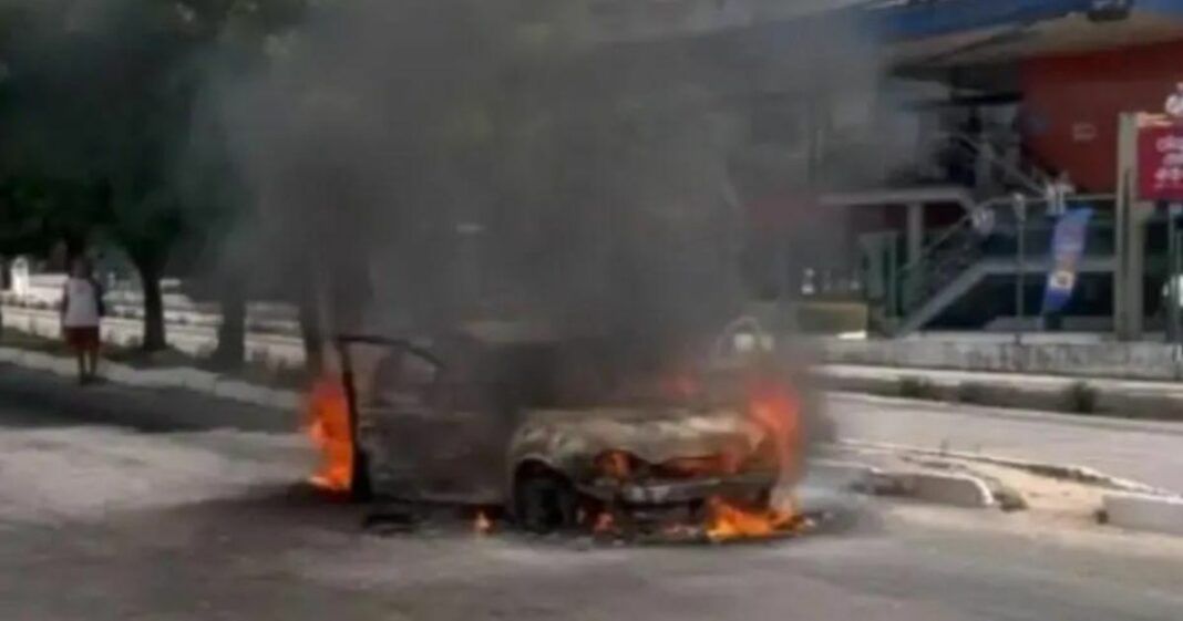 Um carro pegou fogo e ficou completamente destruído na Maria Lacerda (Nova Parnamirim) em frente ao Nordestão.