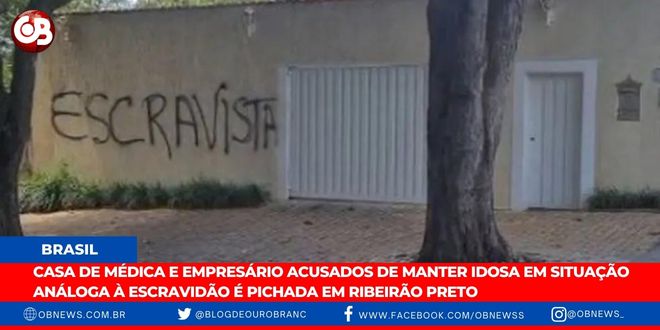 A frente da casa da médica e do empresário acusados pelo Ministério Público do Trabalho (MPT) de Ribeirão Preto (SP) de submeter uma idosa de 82 anos à situação análoga à escravidão foi pichada nesta quinta-feira (8). Na fachada do imóvel, no bairro Ribeirania, zona Leste, foi escrita a palavra “escravista”.