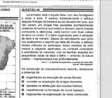 Um reservatório de águas de 86 anos, completamente ligado à história da cidade de Caicó, na região do Seridó, no Rio Grande do Norte, o açude Itans foi o foco de uma das questões da prova de ciências humanas e suas tecnologias no Enem 2022, aplicada neste domingo (13).