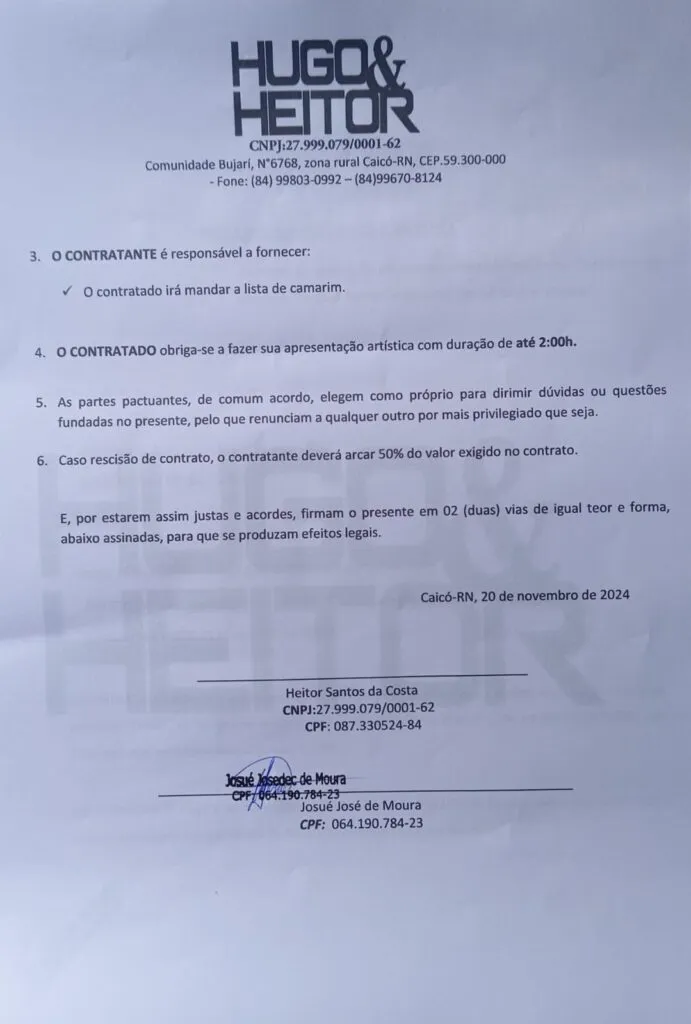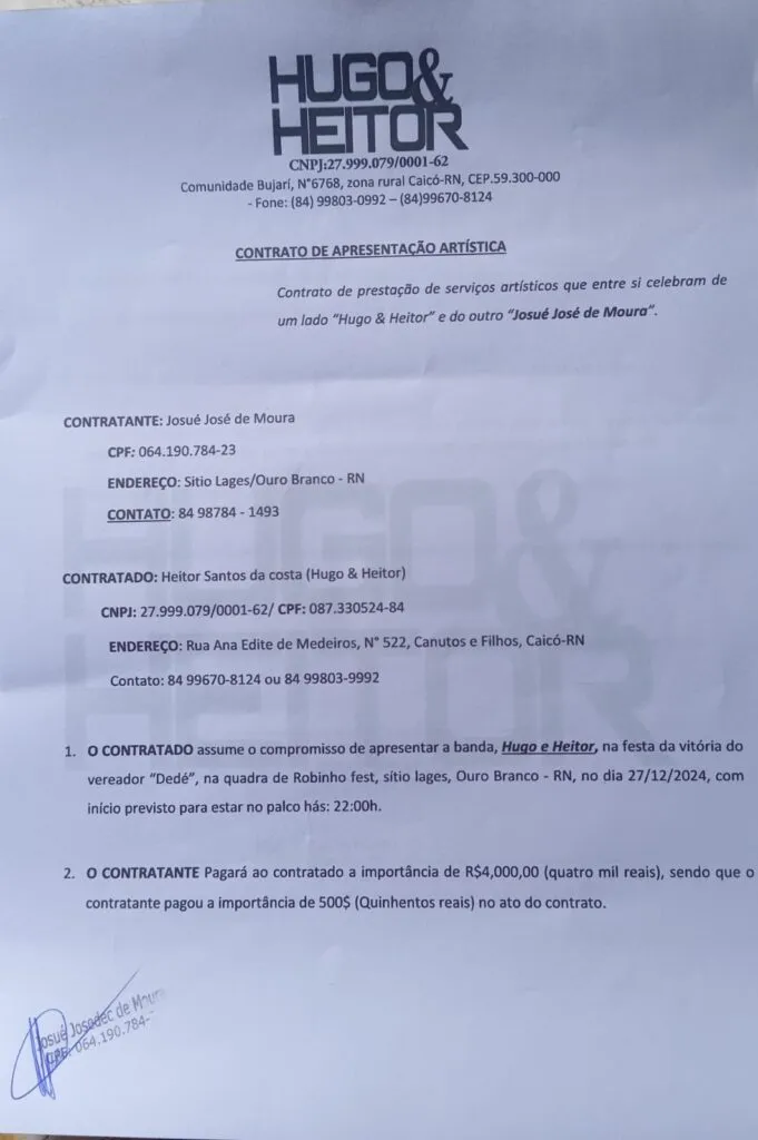 Segundo fontes ligadas ao Legislativo, o contrato da prefeitura foi publicado no portal da transparência com valor fechado em R$ 15 mil. Já o contrato firmado para a apresentação no evento particular do vereador estaria documentado com valor registrado de R$ 4 mil.