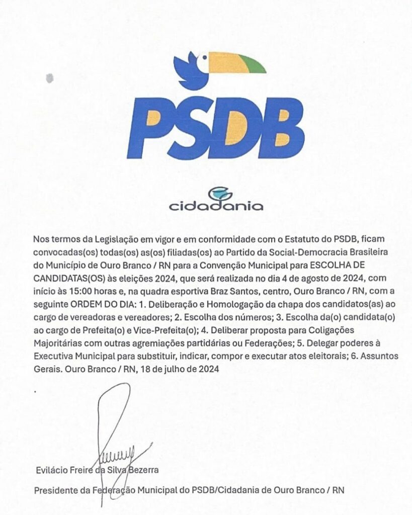 A convenção para homologar as candidaturas a prefeita, vice-prefeito e a nominata de vereadoras e vereadores do partido PSDB acontecerá no próximo dia 4 de agosto, na Quadra Poliesportiva Braz Santos, à partir das 15hs, e contará com a formação da coligação com o MDB municipal, que terá convenção às 14hs.