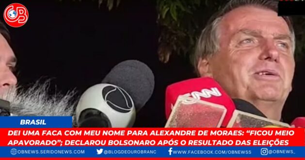 O presidente Jair Bolsonaro (PL), que vai disputar o segundo turno contra o ex-presidente Luiz Inácio Lula da Silva (PT), afirmou em entrevista logo após o resultado das eleições que deu faca perfurada com seu nome para o presidente do Tribunal Superior Eleitoral (TSE), Alexandre de Moraes e que ele “ficou meio apavorado”.
