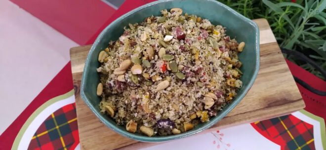 A receita ainda leva castanha-de-caju, amendoim, bacon, azeitona, semente de girassol, semente de abóbora e pimenta-dedo-de-moça.