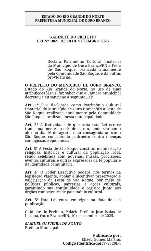 Na última quarta-feira, 10 de setembro de 2025, foi sancionada a Lei Municipal nº 1069, de autoria do vereador Marcos Costa, que declara a Festa de São Roque como Patrimônio Cultural Imaterial do Município de Ouro Branco/RN. A iniciativa busca valorizar uma das mais importantes manifestações de fé e identidade cultural da comunidade local.