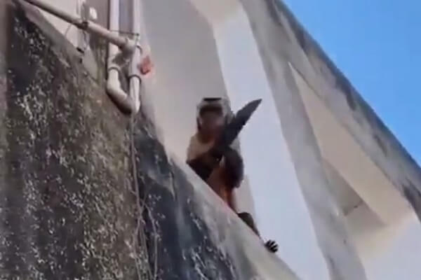 Em vídeo publicado nas redes sociais, um macaco-prego aparece “afiando” uma faca no muro de um prédio no centro comercial do município de Corrente, no interior do Piauí.