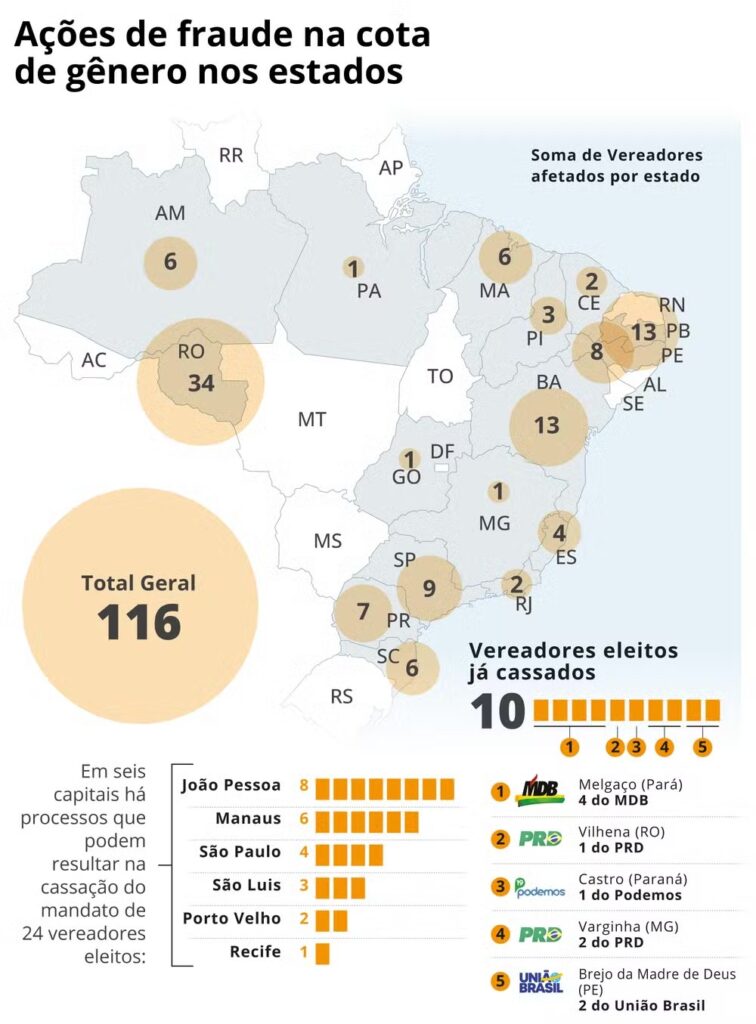 Segundo levantamento do jornal O GLOBO feito com base em dados da Justiça Eleitoral, mais de 30 processos tramitam em 16 estados. Caso sejam julgados procedentes, os vereadores podem perder seus mandatos nesta legislatura.