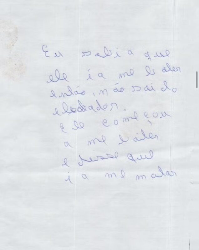 A mulher de 35 anos espancada com mais de 60 socos pelo ex-namorado, dentro do elevador do prédio onde mora em Ponta Negra, na zona sul de Natal (RN), escreveu em um bilhete que o ex-jogador de basquete Igor Eduardo Cabral, 29, afirmou que iria matá-la.