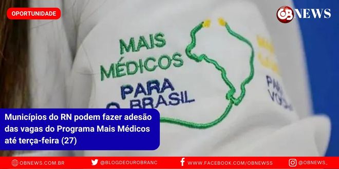 Todos os municípios do Rio Grande do Norte podem aderir às vagas do Programa Mais Médicos até a próxima terça-feira (27). A quantidade é definida pelos gestores municipais, de acordo com as necessidades específicas. No total, foram disponibilizadas 1.194 vagas para os municípios do estado. A expansão das vagas foi autorizada pelo Ministério da Saúde, por meio da Portaria GM/MS Nº 752, de 15 de junho de 2023.