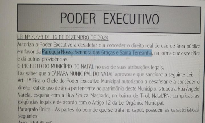 O ex-prefeito de Natal Álvaro Dias (Republicanos) autorizou a cessão, por 20 anos, de um terreno no Tirol, onde está localizada a praça Assis Chateaubriand, para a construção de uma capela, sob a responsabilidade da Paróquia Nossa Senhora das Graças e Santa Terezinha.