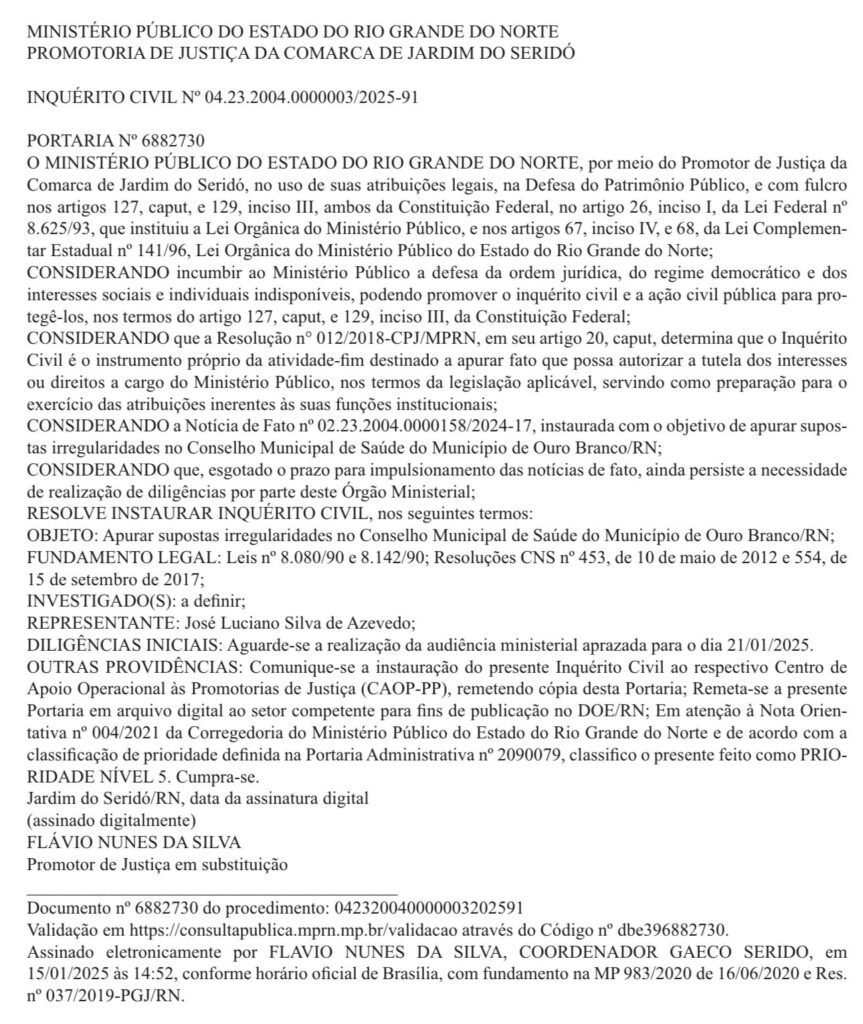 O Coordenador do Grupo de Atuação Especial de Combate ao Crime Organizado (Gaeco) da região Seridó, promotor de Justiça, Flávio Nunes da Silva abriu inquérito no âmbito do Ministério Público do Estado para apurar supostas irregularidades no Conselho Municipal de Saúde de Ouro Branco. Uma audiência foi realizada nesta terça-feira (21), mas nada vazou, como costumamos dizer “Estão tudo caladin”.