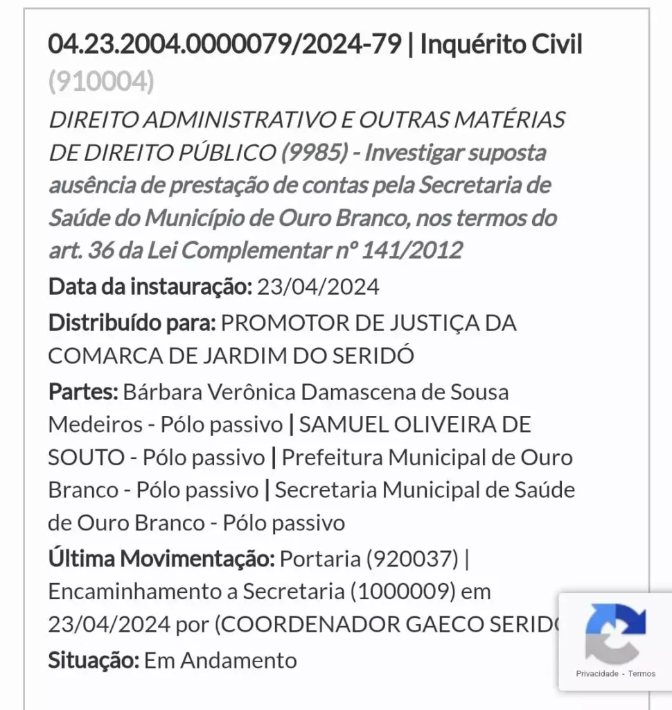 O prefeito Samuel Oliveira de Souto e a Secretária de Saúde, Bárbara Verônica Damascena de Sousa Medeiros, foram investigados no início de 2024, o motivo uma suposta falta de transparência e responsabilidade na aplicação dos recursos destinados à saúde da população de Ouro Branco.