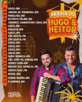 A dupla Caicoense Hugo e Heitor, antigo 4 forrozeiros, divulgou nesta terça-feira (31), a agenda de ‘shows’ da dupla para o mês de junho de 2022. Uma das apresentações da dupla ocorrerá dia 18 de junho, em Ouro Branco, a data coincide com o sábado da festa da colheita 2022.