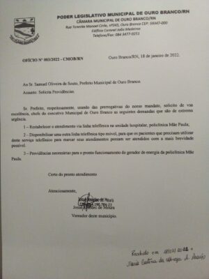 O vereador Josué Josedec (PL) protocolou na manhã de hoje (18) um ofício junto a prefeitura municipal pedindo providências no sentido de solucionar o problema que tem afligido parte da população que procura aquele estabelecimento de saúde pública.
