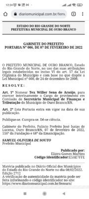 O Prefeito Samuel de Souto definiu Tex Willer Sena de Araújo para exercer interinamente o Cargo de provimento em Comissão de Secretário Municipal de Finanças e Tributação do Município de Ouro Branco/RN. O cargo estava vago desde a saída da contadora Milena Pereira de Medeiros, em 1º de fevereiro deste ano.