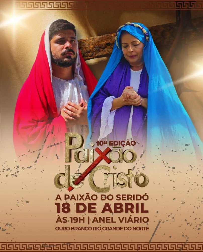 A Associação Cultural In Cantos do Ouro realiza nesta sexta-feira, 18 de abril, a 10ª edição do espetáculo Paixão de Cristo, em Ouro Branco–RN. A apresentação começa às 19h no anel viário da cidade e é gratuita.