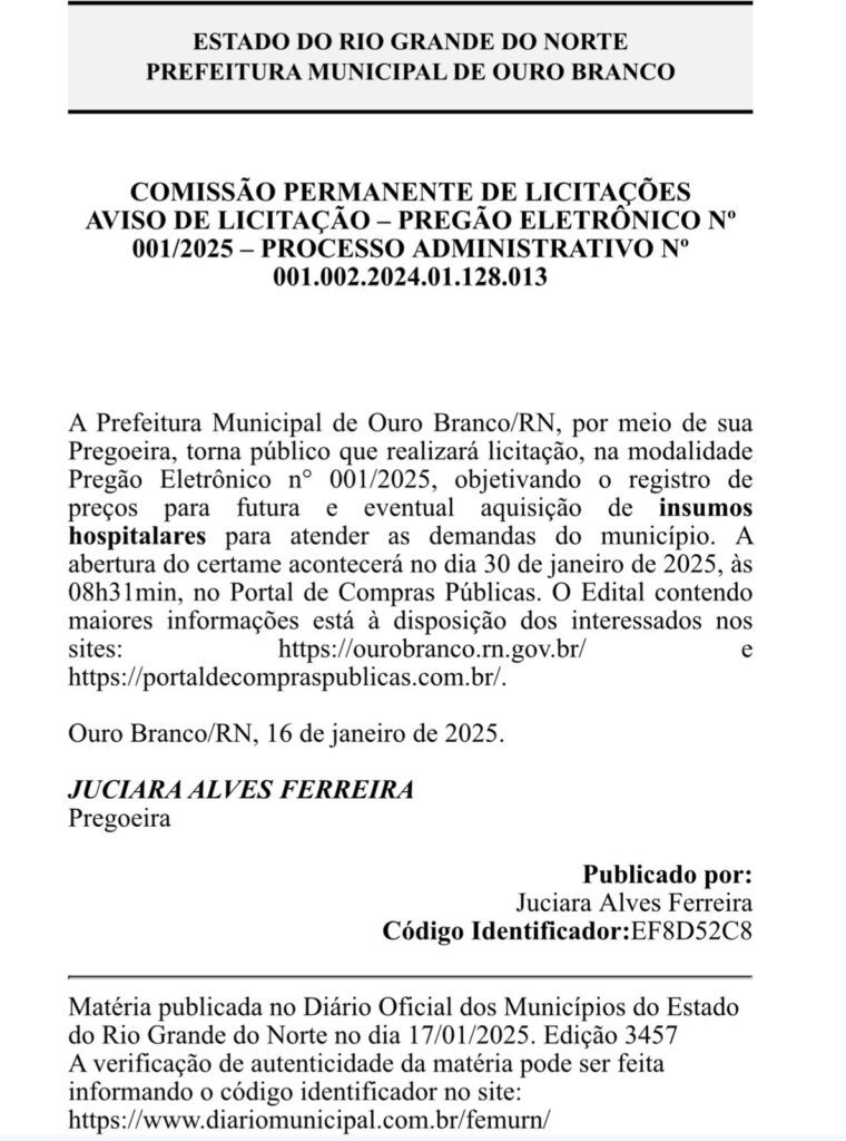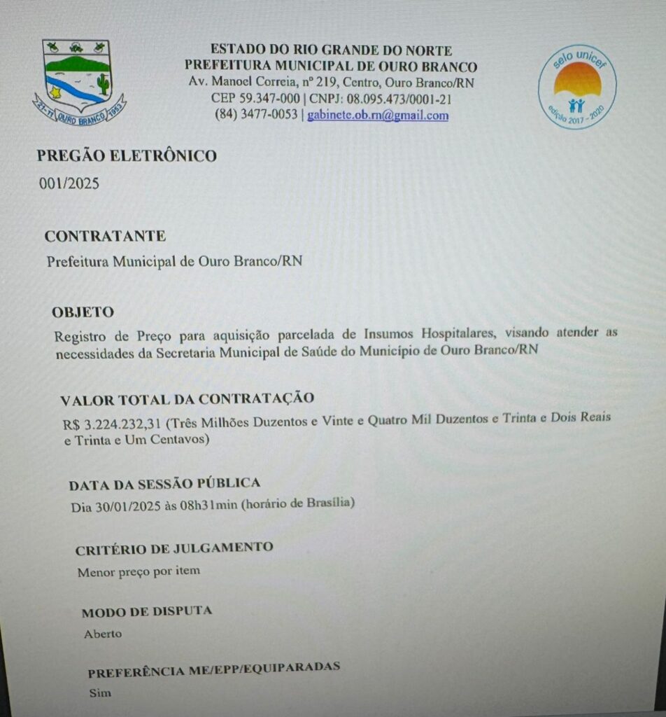 Está chamando a atenção na região do Seridó do Rio Grande do Norte, é um pregão eletrônico que a Prefeitura de Ouro Branco irá realizar na próxima semana. O valor será de R$ 3.224.232,31 (três milhões duzentos e vinte e quatro mil duzentos e trinta e dois reais e trinta e um centavos) para comprar Insumos Hospitalares do município, que tem menos de 5 mil habitantes.