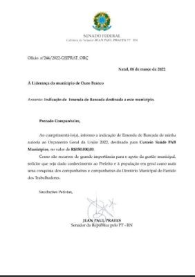 O presidente do PT local, Zulamar Juarez, anunciou em suas redes sociais a conquista de uma emenda no valor de R$ 150.000 para ser aplicada na saúde do município de Ouro Branco.