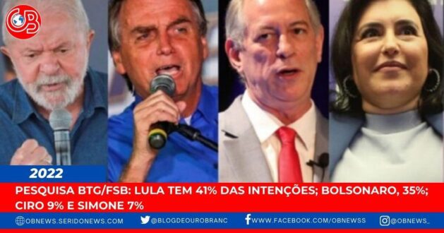 Ciro Gomes (PDT) tem 7% da preferência; Simone Tebet (MDB), 4%. Felipe d’Avila (Novo) e Soraya Thronicke (União Brasil) têm 1% cada. Outros candidatos não pontuaram. Na simulação de segundo turno entre Lula e Bolsonaro, o candidato do PT vence por 48% a 40%. O presidente oscilou um ponto para cima em comparação com a rodada anterior, enquanto Lula caiu 3 pontos.