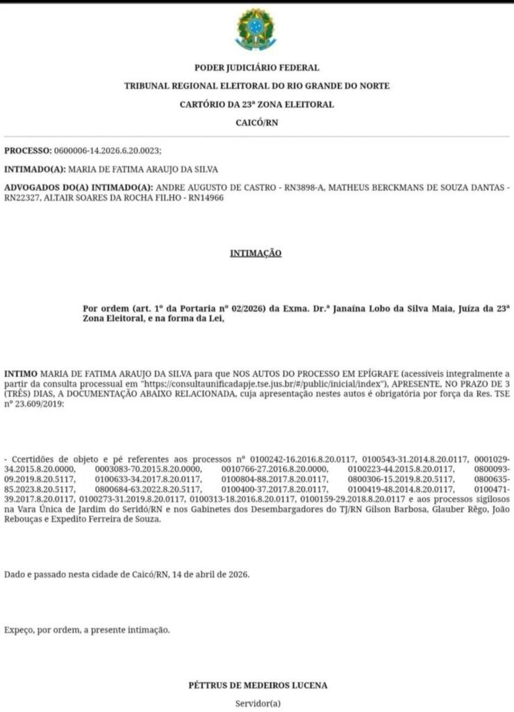 Chega ao fim o prazo dado pela Tribunal Regional Eleitoral do Rio Grande do Norte(TRE-RN) para que a ex-prefeita Maria de Fátima Araújo da Silva apresentasse documentos sobre seu histórico judicial, em Ouro Branco.