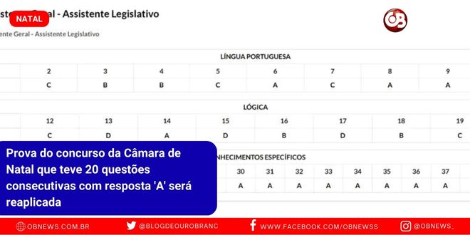 O gabarito de uma das provas do concurso da Câmara Municipal de Natal, realizado no último domingo (18), chamou atenção dos candidatos por contar com 20 questões consecutivas com a opção “A” como resposta correta.