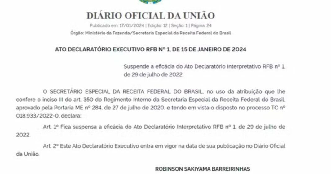 A decisão, assinada pelo atual chefe da Receita, Robinson Barreirinhas, foi publicada no Diário Oficial da União nesta quarta-feira (17).