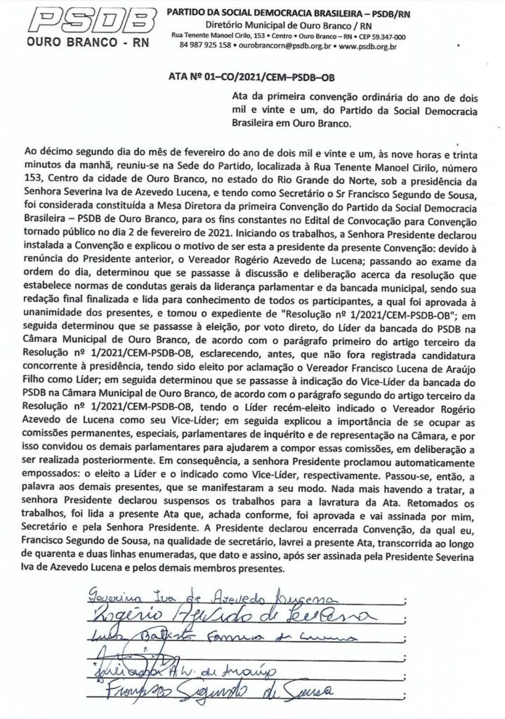 Naquela ocasião, uma reunião comandada pela então presidente da sigla em Ouro Branco, Severina Iva fechou questão com a posição e unidade do partido. Os vereadores que assinaram a ata e aprovaram a resolução foram Lucas Batista, Rogério Lucena e Dr. Araújo, na época escolhido como líder do partido.