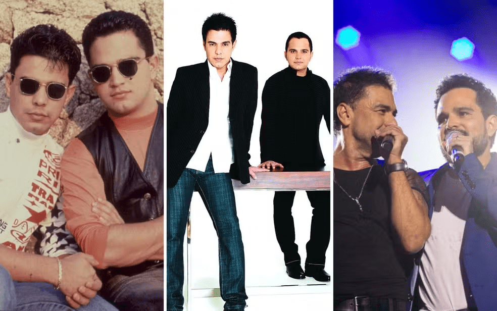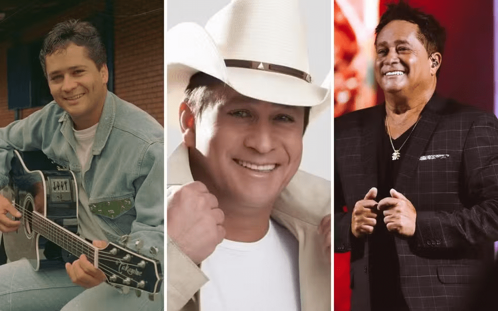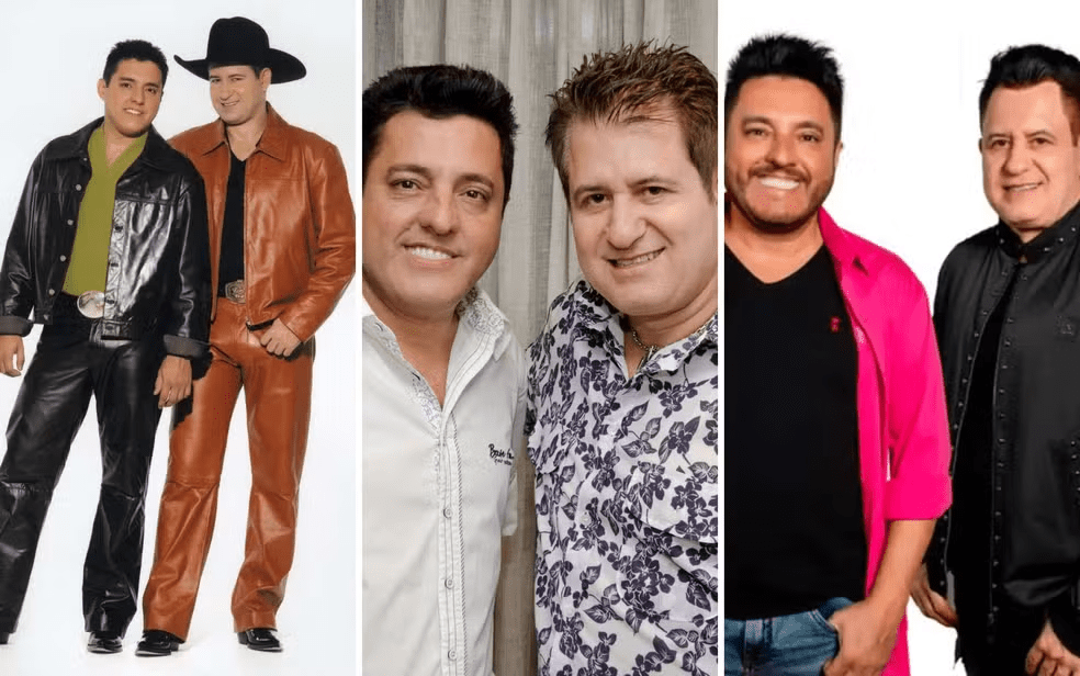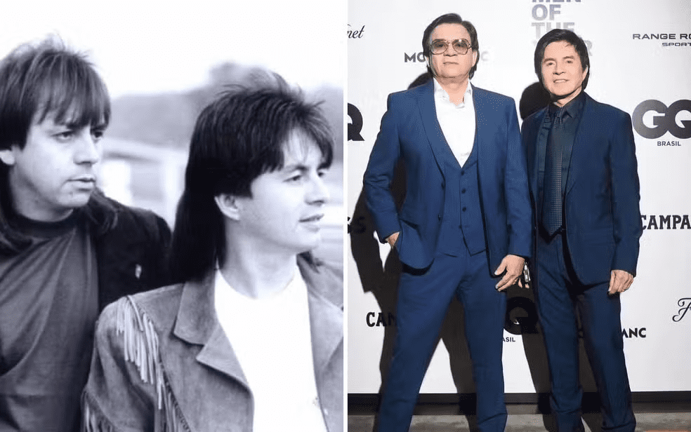 A dupla Chitãozinho e Xororó também mudou bastante. Na primeira foto, em 1980, eles aparecem com os típicos cabelos compridos e franjinha, que marcaram gerações. Lado a lado, eles olham para a paisagem em uma fazenda. Em foto recente, de 2024, eles aparecem mais velhos, mas ainda elegantes, em uma premiação.