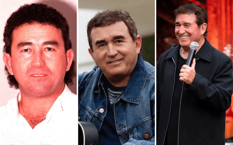 Na primeira foto, em 1989, o cantor Amado Batista aparece com os cabelos compridos e bem mais jovem. Nos anos seguintes, 2010 e 2023, ele já aparece mais velho e com os cabelos curtos. Sempre sorridente, ele usa roupas mais atuais, como jaquetas.