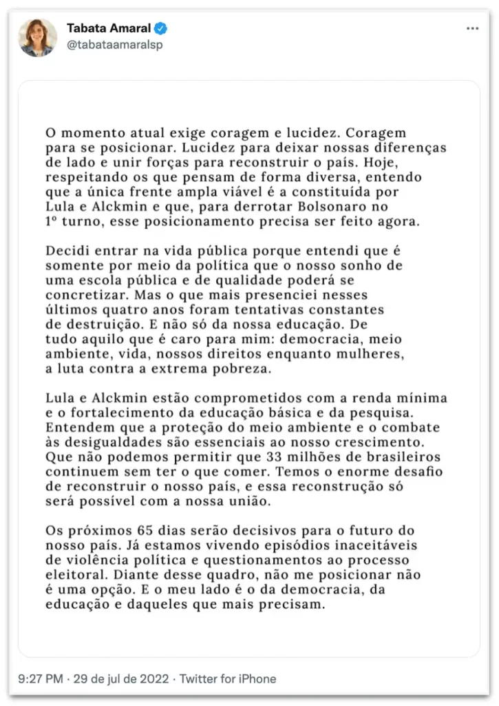 Coragem para se posicionar. Lucidez para deixar nossas diferenças de lado e unir forças para reconstruir o país”, escreveu a deputada em seu perfil no Twitter. “Hoje, respeitando os que pensam de forma diversa, entendo que a única frente ampla viável é a constituída por Lula e Alckmin e que, para derrotar [o presidente Jair] Bolsonaro [PL] no 1º turno, esse posicionamento precisa ser feito agora.