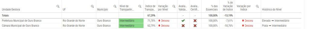 Segundo relatório do Tribunal de Contas do Estado do Rio Grande do Norte (TCE-RN), a Câmara de Vereadores e a Prefeitura de Ouro Branco-RN estão em queda livre no índice de transparência pública, perdendo inclusive o tão comemorado selo prata.