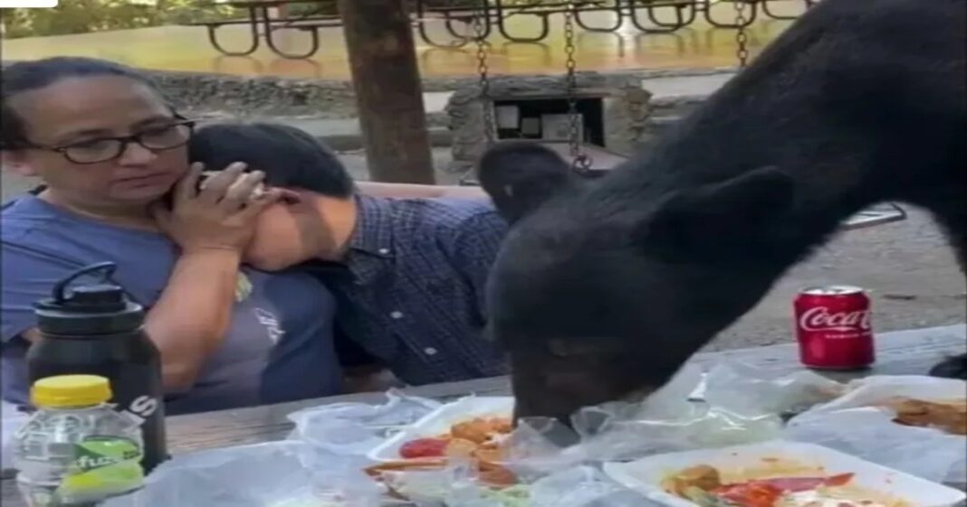 Uma mulher do México precisou de coragem para proteger seu filho depois que um urso subiu em cima da mesa de piquenique em que estavam almoçando e devorou tacos e enchiladas preparados para o aniversário do menino. O animal ficou a centímetros de distância da família.