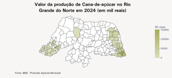 No território potiguar, a produção de cana-de-açúcar continua mais concentrada no Litoral Sul, onde 92,45% da área cultivada analisada é destinada ao produto. Entre os cinco municípios com maior produção, apenas Taipu (no Litoral Nordeste), não está na região.