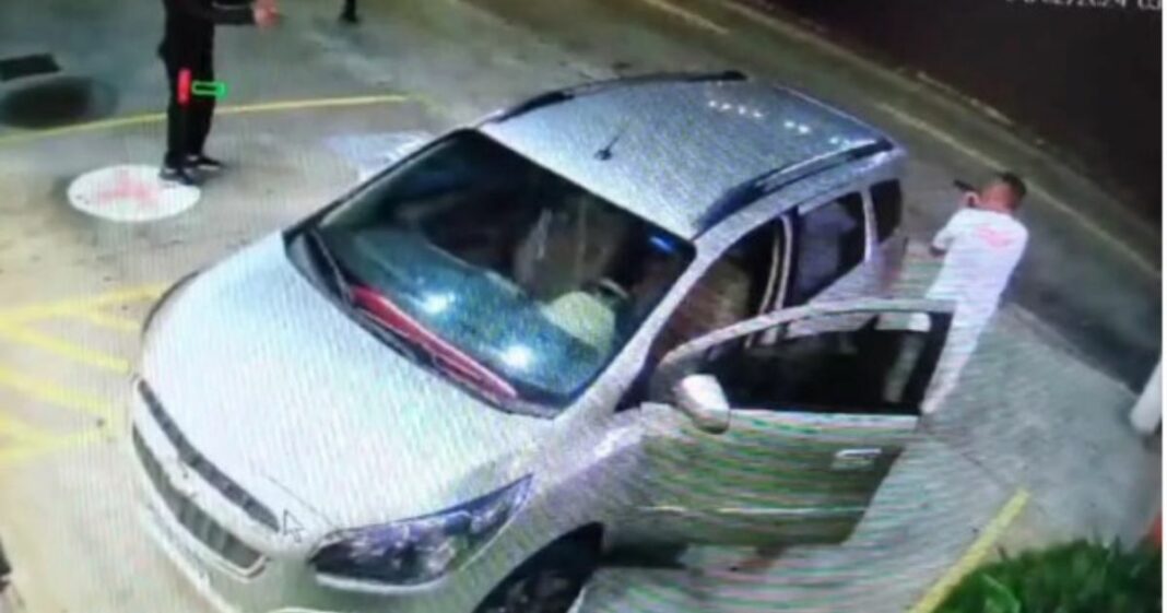 As imagens mostram o cabo Anderson de Oliveira Valentin sem farda, sentado em um carro estacionado em frente à farmácia. A filha do policial está no banco de trás.