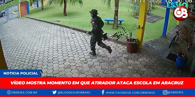 Imagens de câmeras de videomonitoramento mostram o momento em que um homem com roupas camufladas faz o ataque em uma das escolas de Aracruz. Três pessoas morreram e 11 ficaram feridas. O crime aconteceu na manhã desta sexta-feira (25).