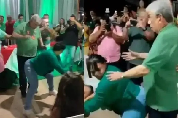 Em certo momento da reunião, a mulher, que estava sentada na primeira fileira, se levantou, ficou de pé em frente ao ex-senador, amarrou o cabelo e começou a dançar de costas para ele, aproximando-se com o bumbum e dando uma espécie de “sarrada”.
